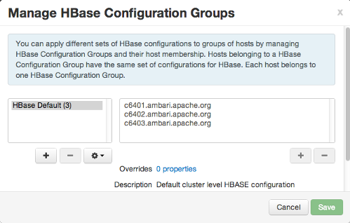 Ambari initially assigns all hosts in your cluster to one, default configuration group for each service you install. For example, after deploying a three-node cluster with default configuration settings, each host belongs to one configuration group that has default configuration settings for the HDFS service. In Configs, select Manage Config Groups, to create new groups, re-assign hosts, and override default settings for host components you assign to each group.