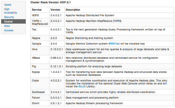 To check which version of the Stack you are using and to see the component versions that are included in that Stack, click Cluster.