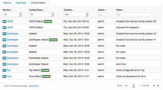 Service Config Version history is available from Ambari Web in two places: On the Dashboard page under the Config History tab; and on each Service page under the Configs tab.