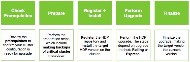 A Rolling Upgrade orchestrates the HDP upgrade in an order that is meant to preserve cluster operation and minimize service impact during upgrade. This process has more stringent prerequisites (particularly regarding cluster high availability configuration) and can take longer to complete than an Express Upgrade.