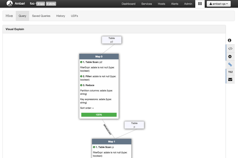 Query execution can be debugged using the embedded Tez view. To access the Tez view, click TEZ in the toolbar on the right of the Worksheet window: