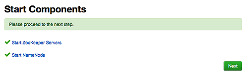 Start Components : The wizard starts the ZooKeeper servers and the NameNode, displaying progress bars to let you track the steps. Click Next to continue.