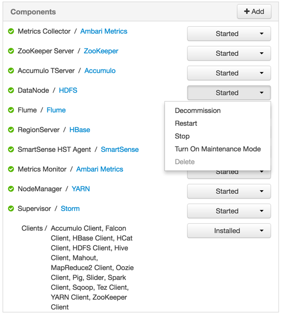 Alternatively, choose action options from the drop-down menu next to an individual component on a host. The drop-down menu shows current operation status for each component, For example, you can decommission, restart, or stop the DataNode component (started) for HDFS, by selecting one of the options shown in the following example: