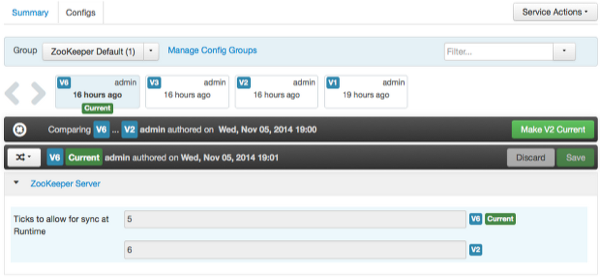 Ambari displays a comparison of V6 to V2, with an option to revert to V2 (Make V2 Current). Ambari also filters the display by only Changed properties, under the Filter control: