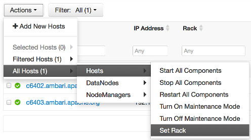 There are two ways using Ambari Web to set the Rack ID: for multiple hosts, using Actions, or for individual hosts, using Host Actions.