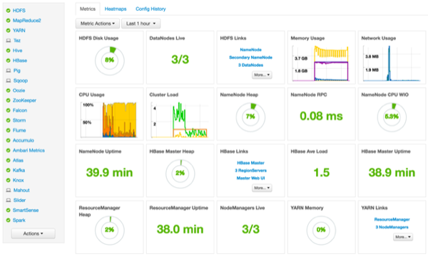 Ambari Web UI displays the Dashboard page as the home page. Use Dashboard to view the operating status of your cluster.