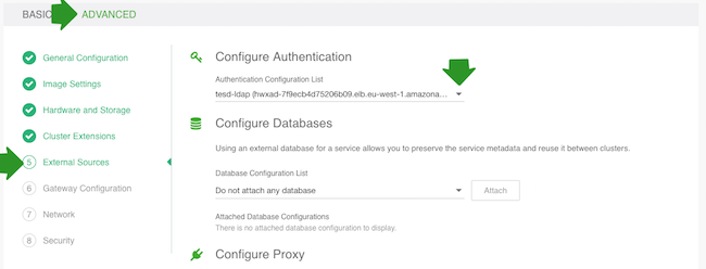 2. Use it as an authentication source for your clusters. Once registered, the LDAP will now show up in the list of available authentication sources when creating a cluster under advanced External Sources > Configure Authentication.