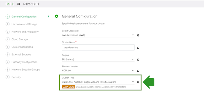 The instructions below only list data-lake specific steps. For information on other cluster options refer to the documentation for creating clusters on your cloud platform.