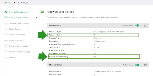 - Under Instance Count, you can optionally specify how many nodes should be included in each host group. By default, Cloudbreak creates the minimum viable number of nodes. We recommend placing an odd node number of nodes in each host group. A total of 3 or 5 instances is recommended.
