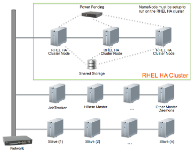 • The RHEL HA cluster machines. These machines must host only those master services that require HA (in this case, the NameNode and the JobTracker).