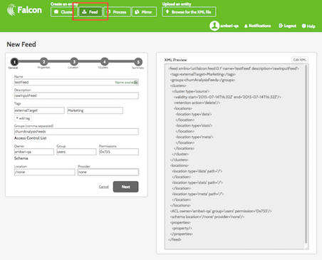 To use the Falcon web UI to define a feed entity: