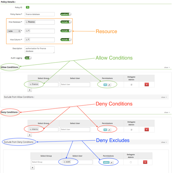 For example, you can allow access to a "finance" database to all users in the "finance" group, but deny access to all users in the "interns" group. Let's say that one of the members of the "interns" group, "scott", needs to work on an assignment that requires access to the "finance" database. In that case, you can add an Exclude from Deny condition that will allow user "scott" to access the "finance" database. The following image shows how this policy would be set up in Apache Ranger: