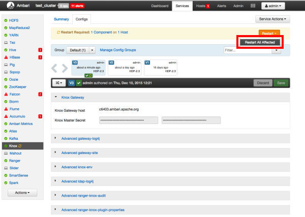 Select Knox in the navigation menu, then select Restart > Restart All Affected to restart the Knox service and load the new configuration.