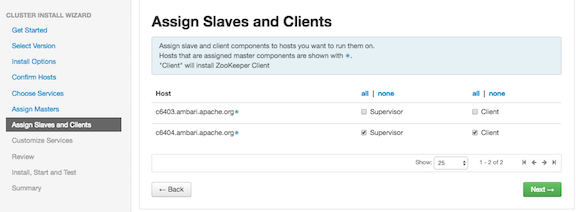 On the Assign Slaves and Clients page, choose the nodes that you want to run Storm supervisors and clients: