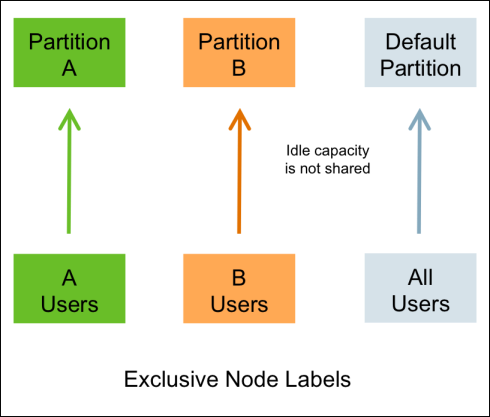 Node labels enable you partition a cluster into sub-clusters so that jobs can be run on nodes with specific characteristics. For example, you can use node labels to run memory-intensive jobs only on nodes with a larger amount of RAM. Node labels can be assigned to cluster nodes, and specified as exclusive or shareable. You can then associate node labels with capacity scheduler queues. Each node can have only one node label.