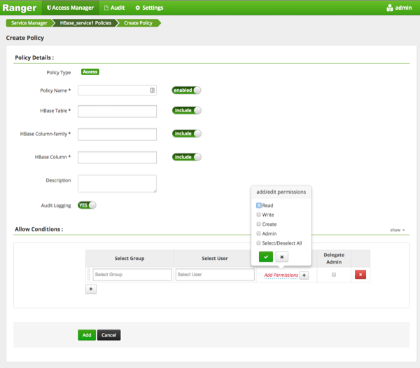 Policy Name Enter an appropriate policy name. This name cannot be duplicated across the system. This field is mandatory. HBase Table Select the appropriate database. Multiple databases can be selected for a particular policy. This field is mandatory. HBase Column-family For the selected table, specify the column families to which the policy applies. HBase Column For the selected table and column families, specify the columns to which the policy applies. Description (Optional) Describe the purpose of the policy. Audit Logging Specify whether this policy is audited. (De-select to disable auditing). Table 3.43. Allow Conditions