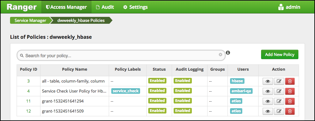 To view the policies associated with a service, click the service name on the Resource Based Policies Service Manager page. The policies for that service will be displayed in a list, along with a search box.