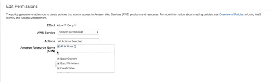 Parameter Value Effect Allow AWS Service Amazon DynamoDB Actions All Actions Amazon Resource Name (ARN) * Your configuration should look similar to:
