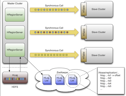 - When the slave cluster is finally available, the buffer is applied in the same way as during normal processing. The master RegionServer then replicates the backlog of logs that accumulated during the outage.